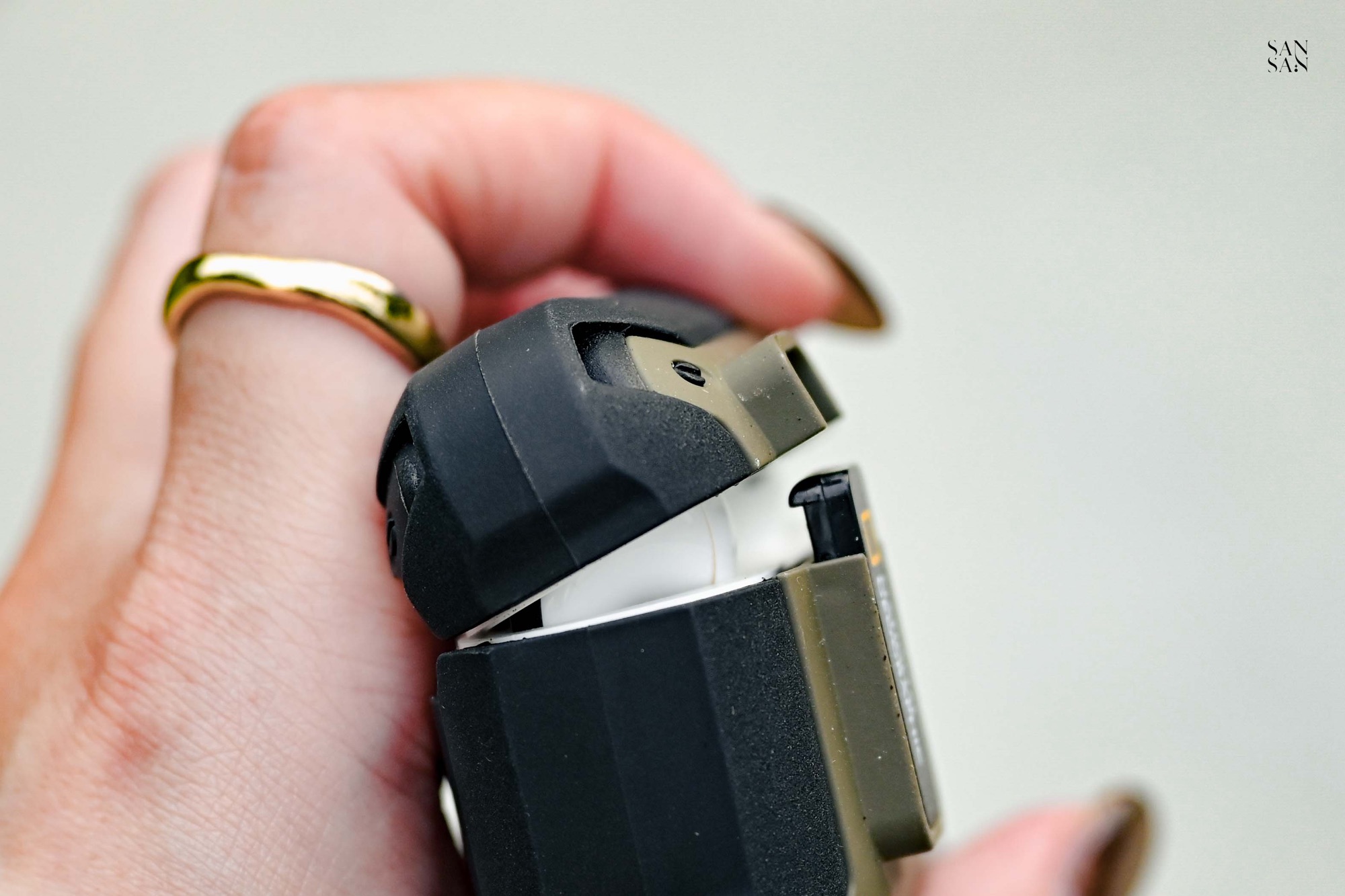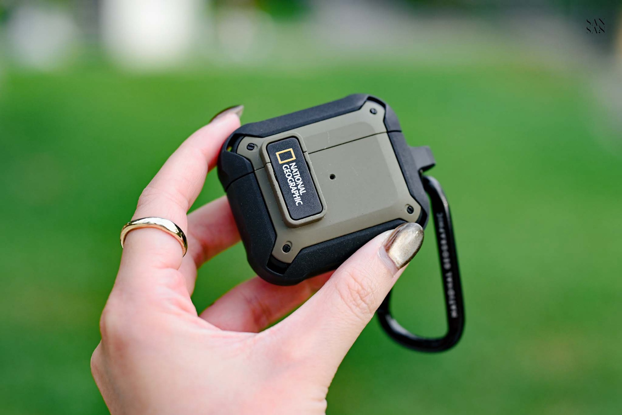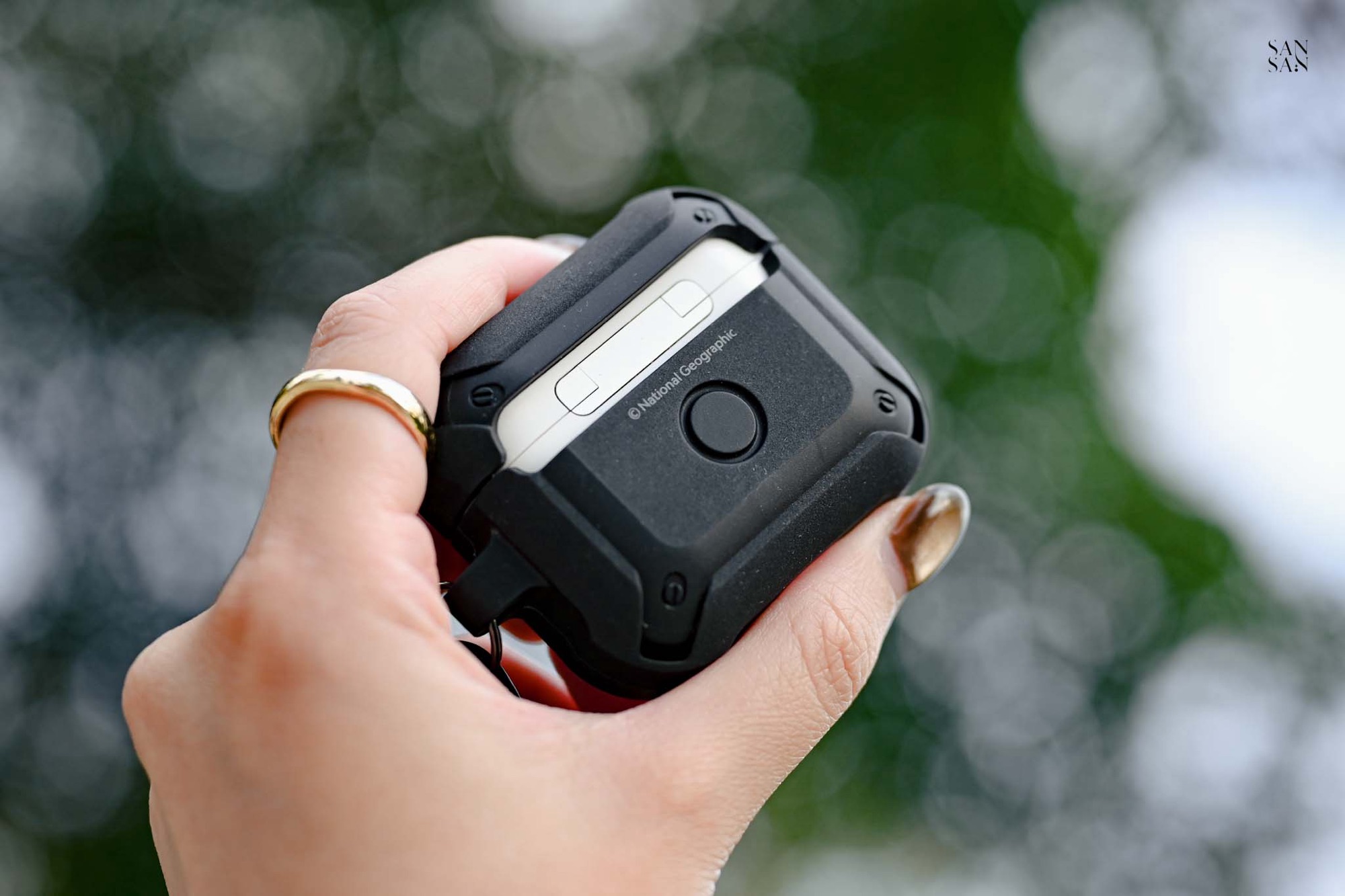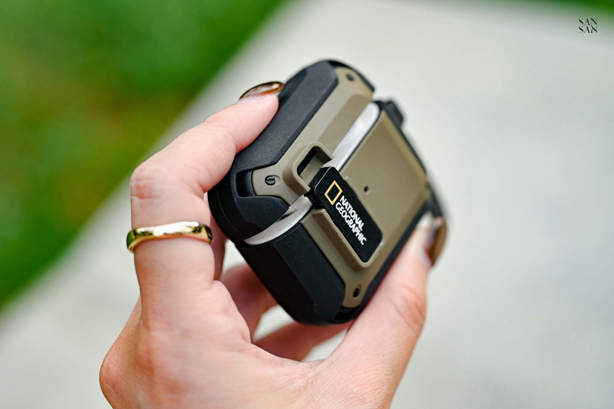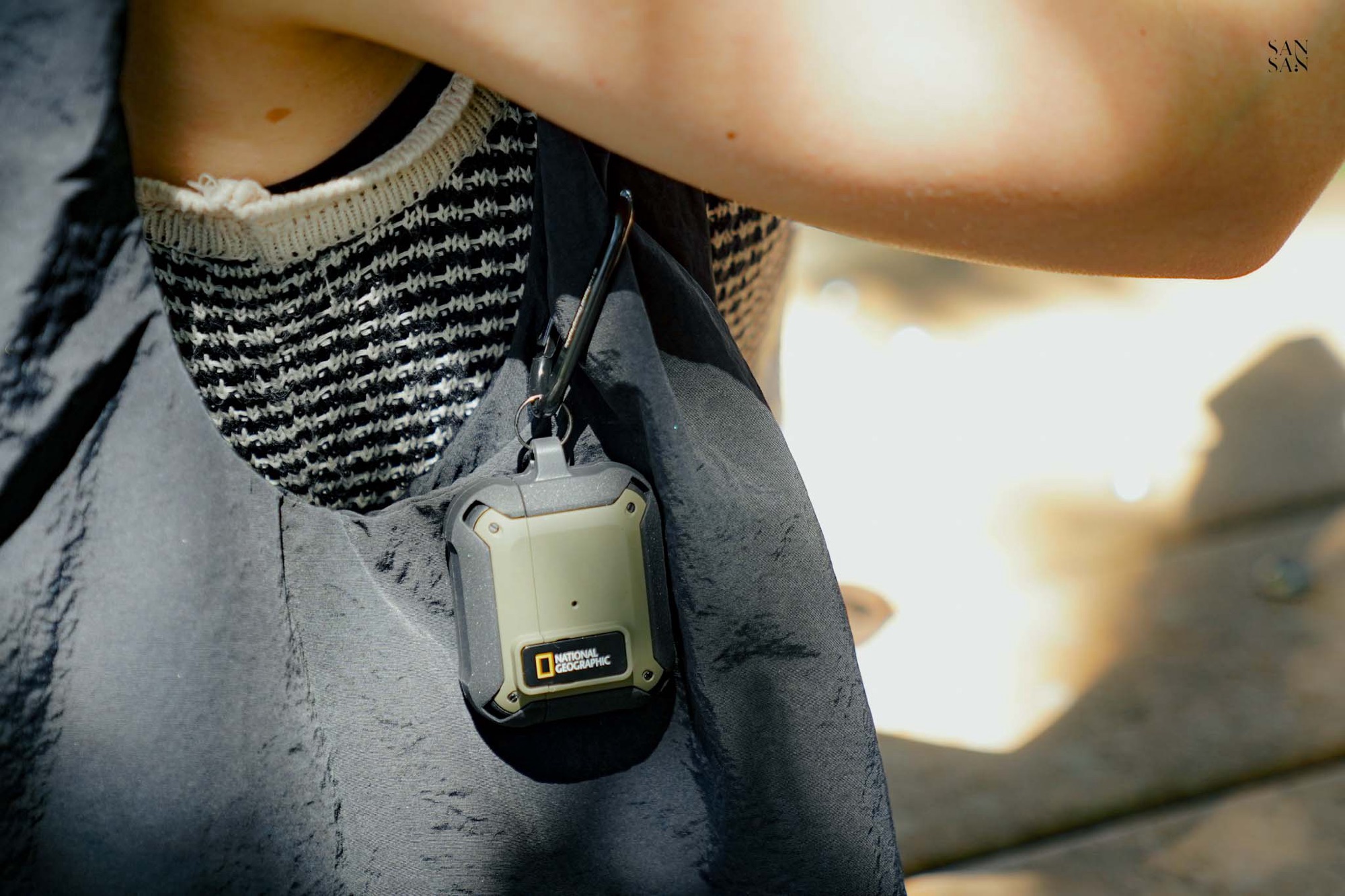 接著是同樣讓sansan期待的 AirPods 的卡扣式耳機殼,延續 國家地理 一貫的戶外探險風格,選用抗震PC材質與彈性極佳的TPU雙材質結合,讓殼身保有有防刮耐磨的優點,全包覆彈性殼又能有效緩衝掉落時的衝擊。