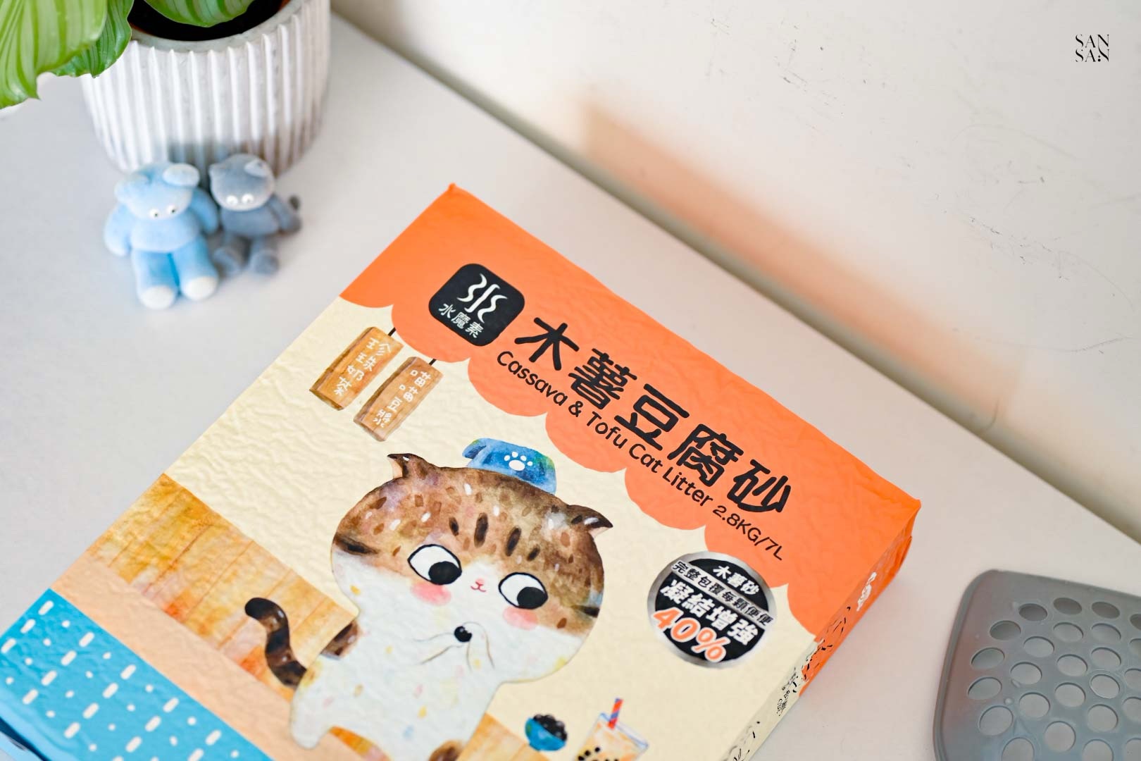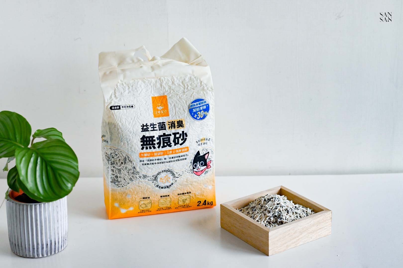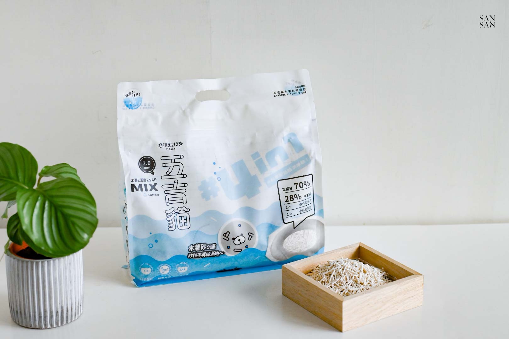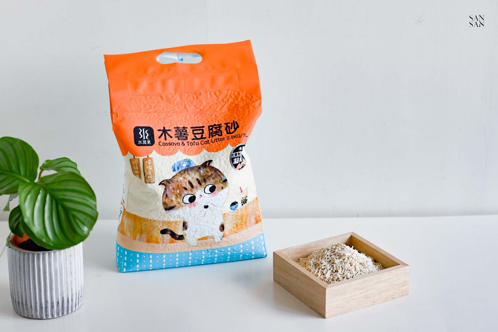 許多使用木薯砂的網友會提到:落砂好嚴重、會有蚊蟲等問題,而這次sansan選擇的「木薯豆腐砂」則是用混合的設計,解決並放大木薯砂與豆腐砂各自的優缺點!