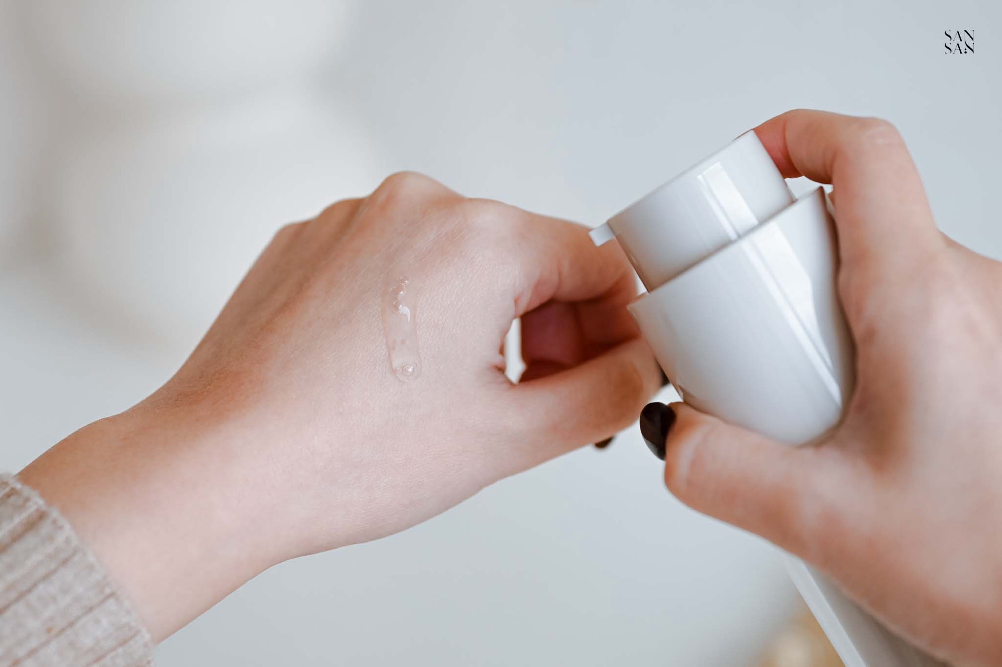 精華液推開時不會黏、不會悶,持續按摩達到深層吸收,肌膚被水分填滿後變得柔軟、細緻的狀態。
